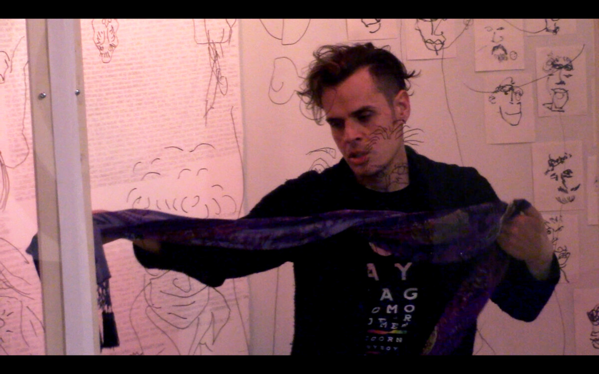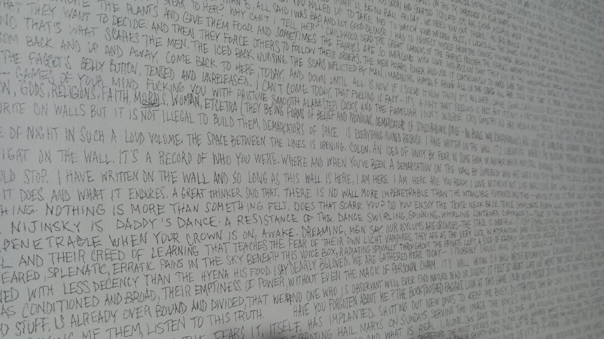 THE BUCKTOOTHED F△GG⊙T (or THE NIJINSKY INCANTATION) is an act of Solve et Coagula: dissolving something into its smallest pieces to coagulate them into a higher, integrated whole. This communal incantation is born from automatic writings recorded on a wall in my studio during my 18-month pandemic lockdown. The result is a raw, intimate, dreamlike transmutation of sexuality and Self exploring fascism’s effect on the individual and society, and patterns of marginalization of the Queer population that we then take into ourselves and hopefully learn to undo: learn to trust our own beings, impulses, and desires. Its raw vulnerability and immersive reflection is a journey of acceptance toward the wholeness of ourselves, and each other, before our time is through.