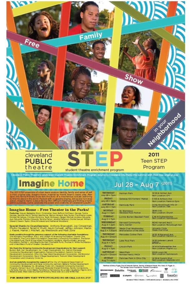Executive Artistic Director Raymond Bobgan is proud to announce Cleveland Public Theatre's celebrated Student Theatre Enrichment Program (STEP) returns to Cleveland City Parks this summer with their new original play entitled "Imagine Home". The 2011 STEP ensemble of teens explore identity, family and sense of self in their original play, Imagine Home. Working in close collaboration with CPT Teaching Artists, teenagers met for five hours per day five days per week to develop every element of the play. Inspired by Henrik Ibsen's classic play "Peer Gynt", this family-friendly show tells the story of a mischievous outcast searching to find his place in the world. Packed with a cappella singing, dance and non-stop action, "Imagine Home" is about facing life's difficult challenges and finding a home within ourselves. Come celebrate the power and creativity of Cleveland's youth!