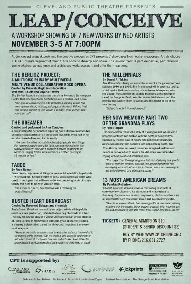 Rusted Heart Broadcast is a multi-year project which will hopefully result in a new production, intended to tour neighborhoods in a tent. The play follows the story of a young Cleveland woman whose attempt at rising to fame in Hollywood is cut short by an apocalyptic plague-a sleeping sickness that claims the distracted, impatient and unaware-most everyone.