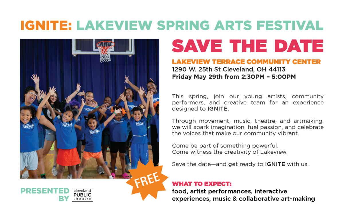 On May 29, 2026, Cleveland Public Theatre presents a community arts festival at Cuyahoga Metropolitan Housing Authority’s Lakeview Terrace! Join the young artists in our CMHA CAN program and members of the Lakeview community in a celebration of creativity with food, performances, and interactive experiences. The event runs 2:30–5pm at the Lakeview Terrace Community Center.